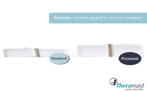 Theramaid Gesichtsauflagen gibt es in zwei unterschiedlichen Versionen. Beide haben die Maße 28 mal 35 cm. Die Standard Auflagetücher sind dünner und günstiger wohingegen die Premium Auflagetücher beinahe 2 MAL so dick sind und Ihren Patienten und Klienten dadurch einen angenehmeren Liegekomfort ermöglichen.